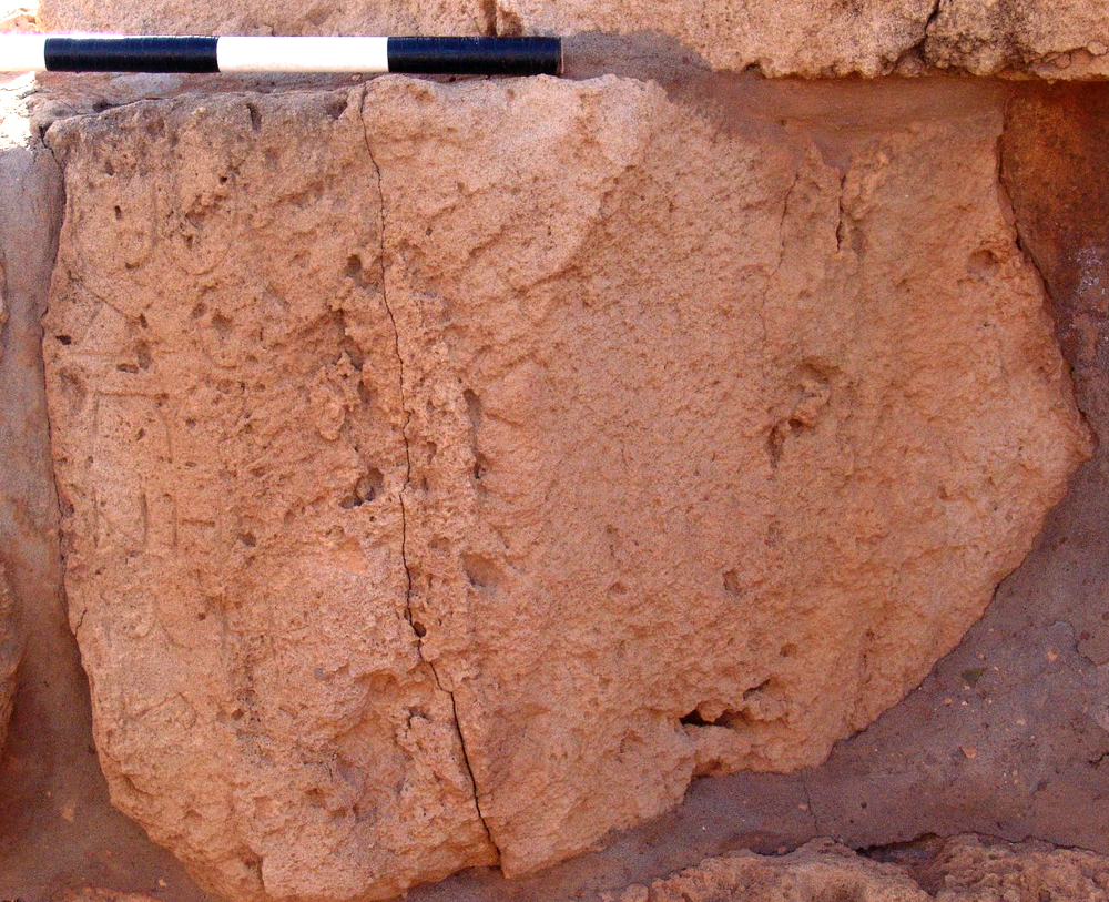 Description: Block of limestone, probably cut down for re-use, badly damaged to the right