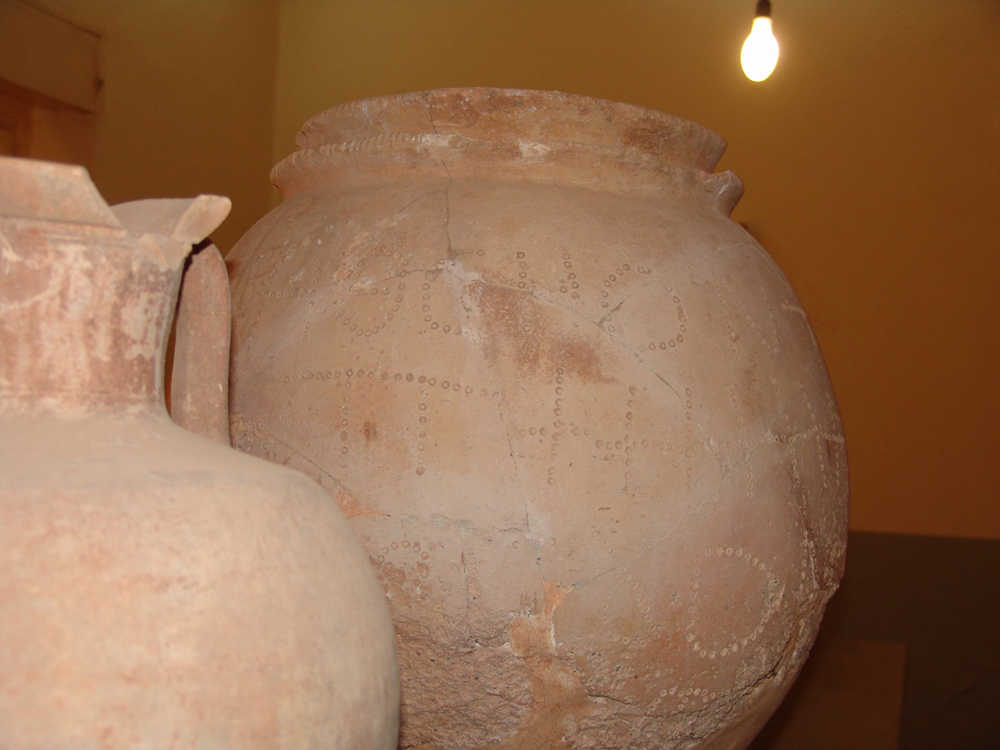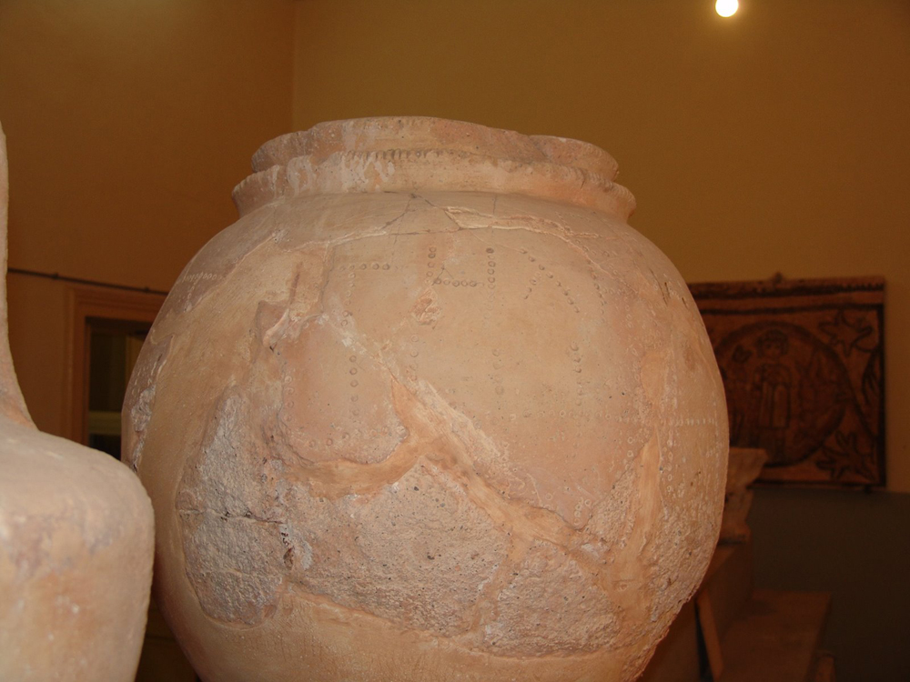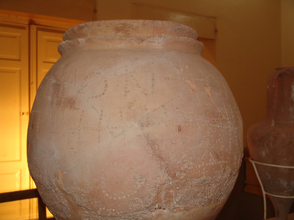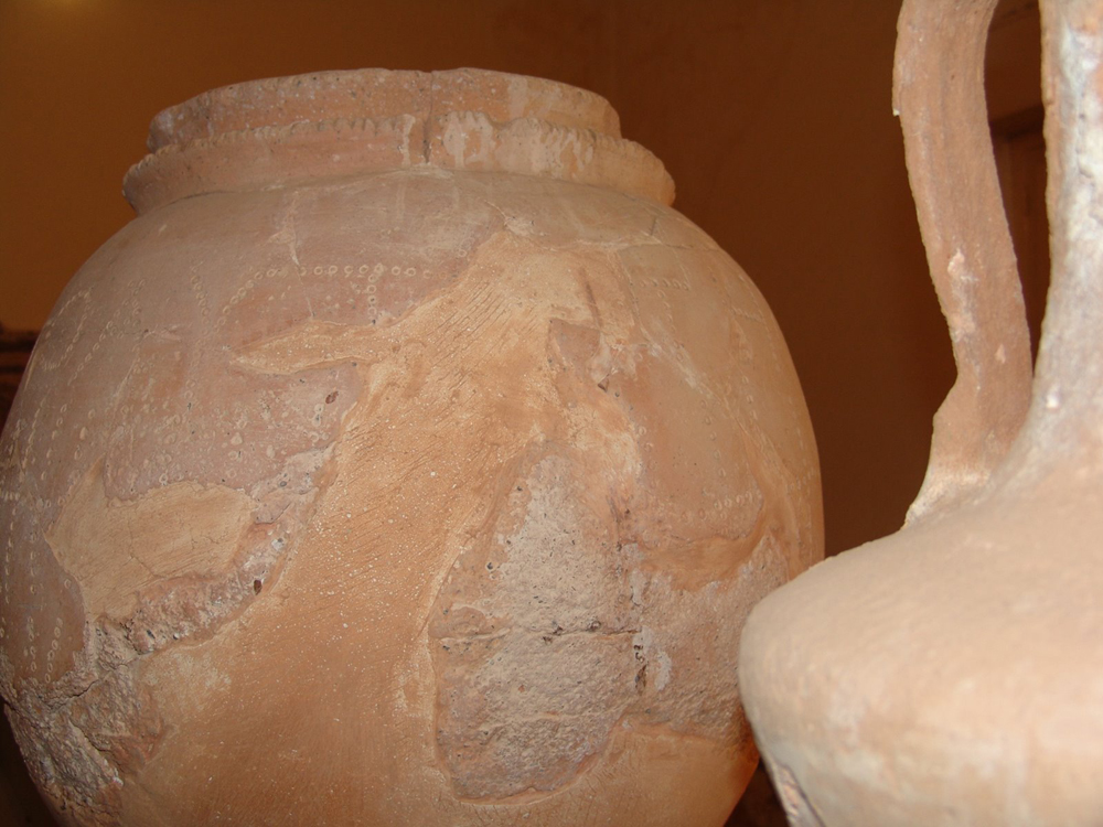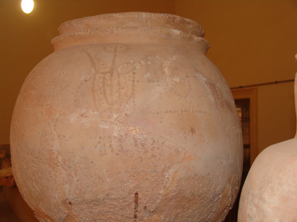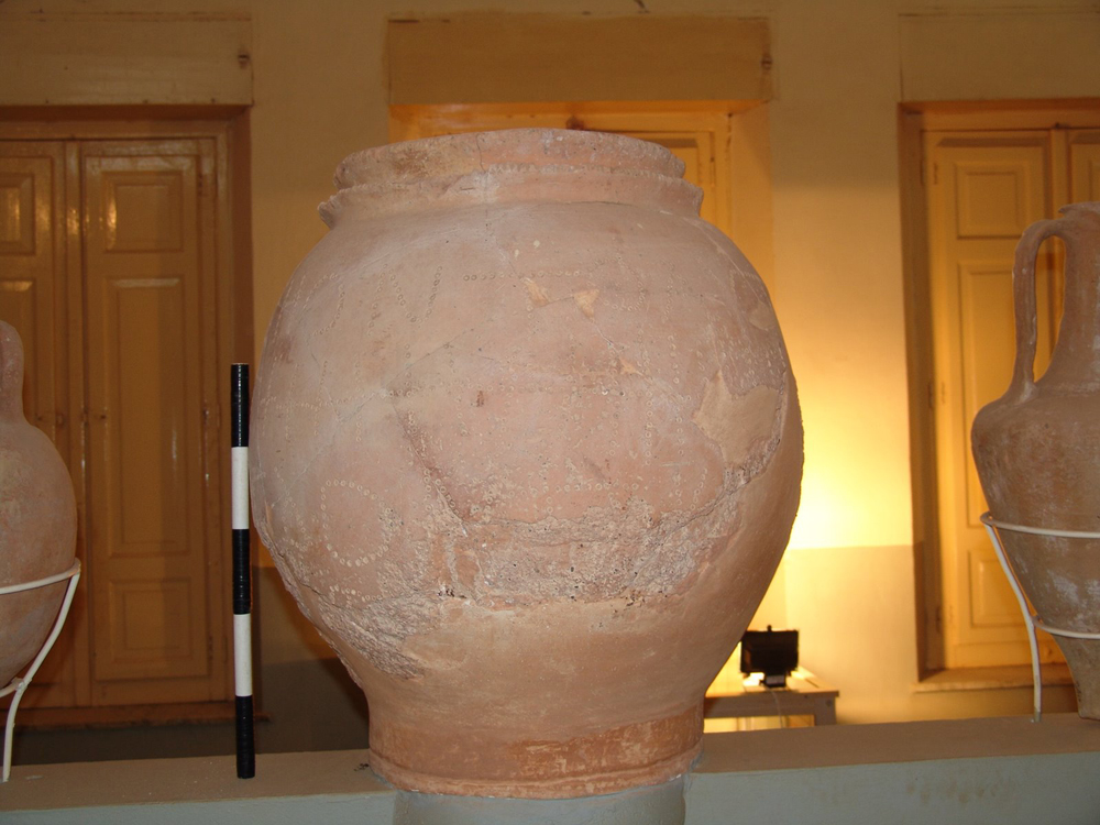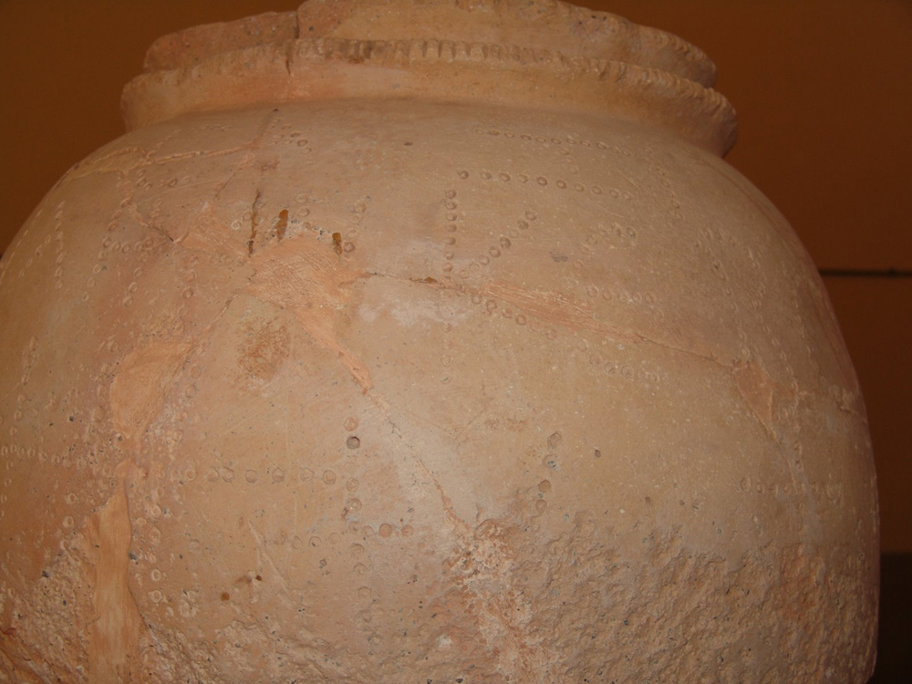 Text: Stamped, a. on the rim; b. on the belly. A crude figure with arms outstretched has been drawn in