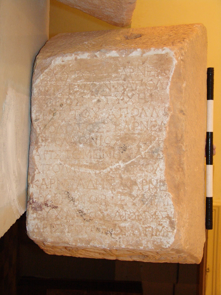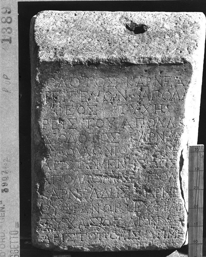 Diodotos (scil. son) of Karneades, the acting priest of Apollo, (scil. set this up). The God and [Good] Fortune (be with us).