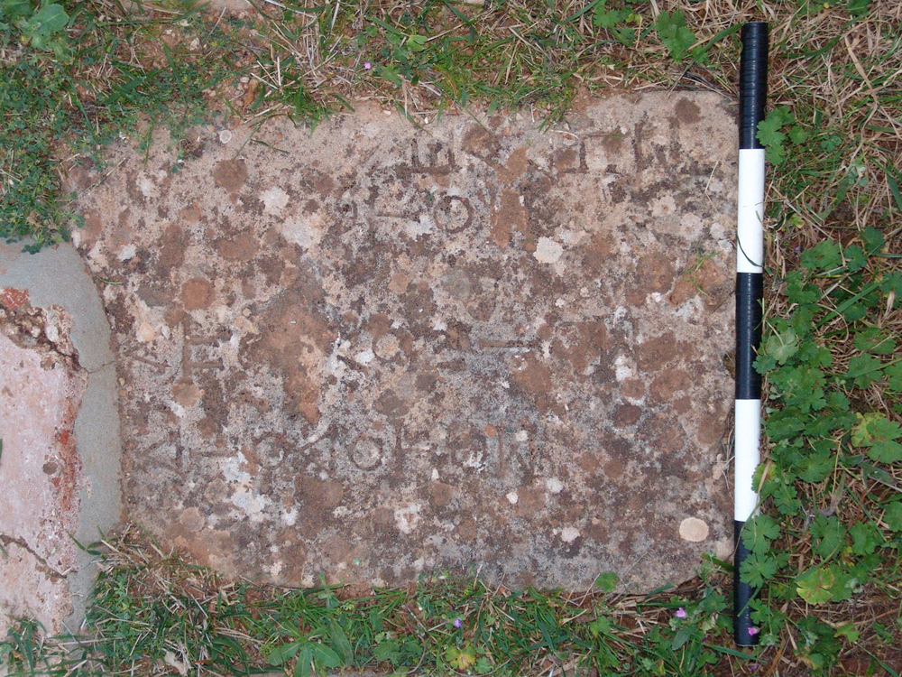 Text: Inscribed on the exposed face whose upper right corner has been smoothed,