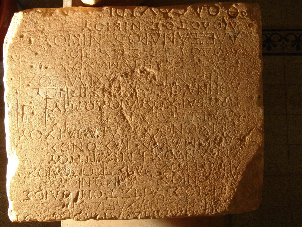 Letters: a: Lines 1-16, first century CE; line 17 with lunate sigma and probably epsilon, may be later. 0.025-0.03; bars above Π and ΚΟ in line 17; b: Bars above the initial letters of lines 3, 4; 0.003.; c: 0.03.