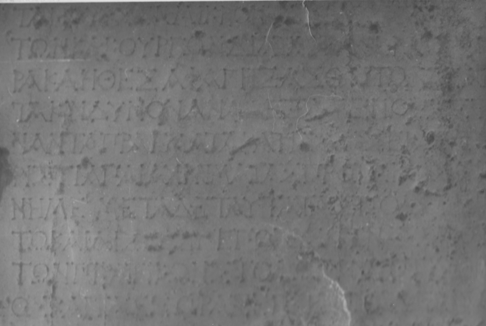 διατιχεύσ[ας] : διατελεύσ[ας] may be possible 20: δεχόμεν[ος - - - - -] Laronde, 1987 21: τᾶι omitted. Reynolds, 1973-1974a; χρ[όνον - - - - - - δ]ό- Laronde, 1987 22: ΚΑΙ Reynolds, 1973-1974a; καὶ Laronde, 1987 23: ΕΠΩΙΠΛΕΟΝ[ - - Laronde, 1987 J. Bingen suggested ἐφ’ὧι 24: θά[λασσαν παντὶ σθένει - - Laronde, 1987 27: χώραν[ - - ]πολ[- - Laronde, 1987 29: ΚΕ[ . . . Reynolds, 1973-1974a 30: δ[.]ειμένοις πλιστ[ . . . Reynolds, 1973-1974a; ἀ[φ]ειμενοις παισὶ[ . . . Laronde, 1987 31: τε τᾶς[ --- Laronde, 1987 32: τὰν σύγκλητον[- - - Laronde, 1987 the further traces here are in fact consistent with δῆμου Ῥωμαίων. 32-33: - - - ἀπο]δοχᾶς Moretti, 1976a; - - - μεγαλᾶς ἀπο]δοχᾶς following a suggestion by Moretti Laronde, 1987 33: πίστ[- . . . Reynolds, 1973-1974a; πίστε[ως - - - Moretti, 1976a; πισ[τέως ἀξιωθείς following a suggestion by Moretti Laronde, 1987 34: πραξάμενος ἀναθ[ - - - Laronde, 1987 35: τότε ἐπρεσ[βευε- - - Reynolds, 1973-1974a; τοῖς τε πρεσ[βευσαμενοις - - - Moretti, 1976a; τοῖς τε πρεσ[βευσαμένοις διὰ παντὸς τῶ χρό]|νω Laronde, 1987 but squeeze and photographs seem against τοῖς 37: τᾶ[ς - - - ]ΑΤΑ Laronde, 1987 39: κτησ[ . . .]ΑΦΕΒ[.]ΟΝ ἔπεχ[ε] Reynolds, 1973-1974a; κτησ[ίμ]α βεβαιον ἐπέχ[.] Laronde, 1987 41: ἀποδει[ξ - - - Laronde, 1987; ἐς τὰν ἐπ[.] Laronde, 1987 42: [- - -]ΤΩΣΤΕ[- - - - -] ΠΟΤ [- - ] Laronde, 1987