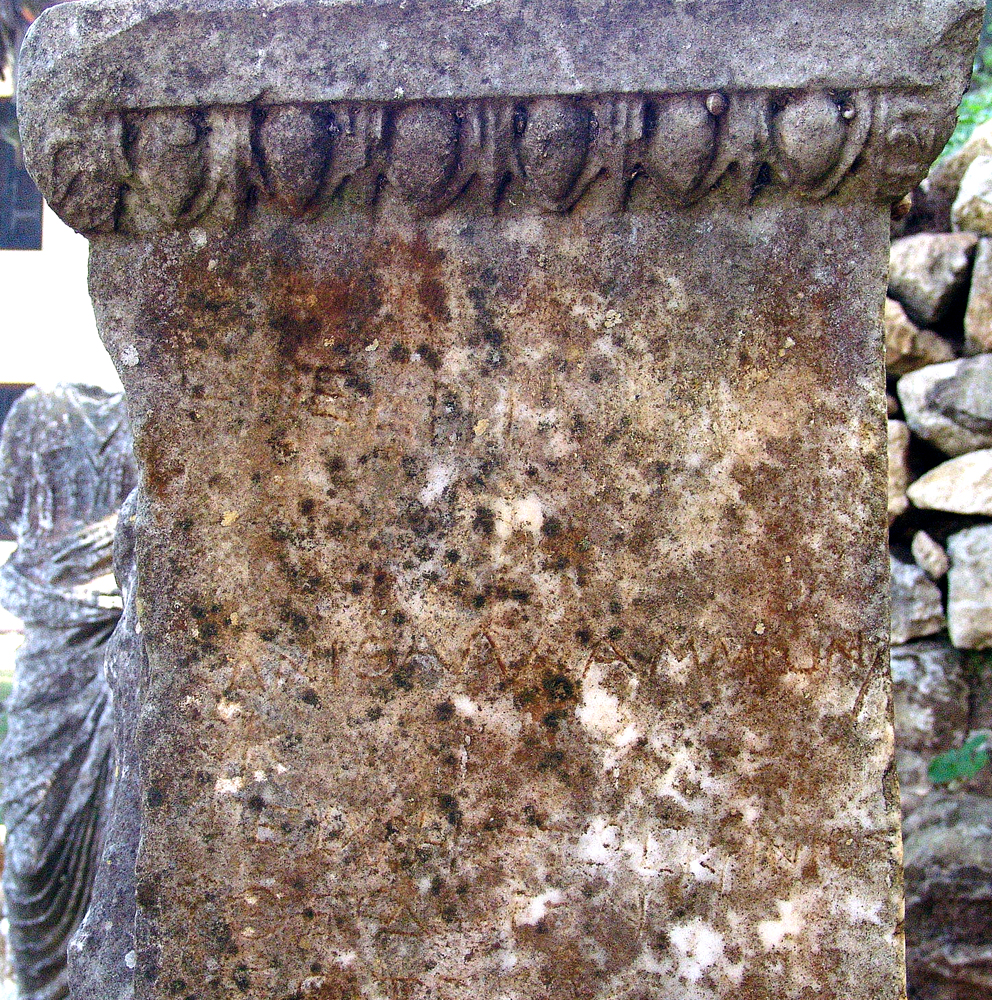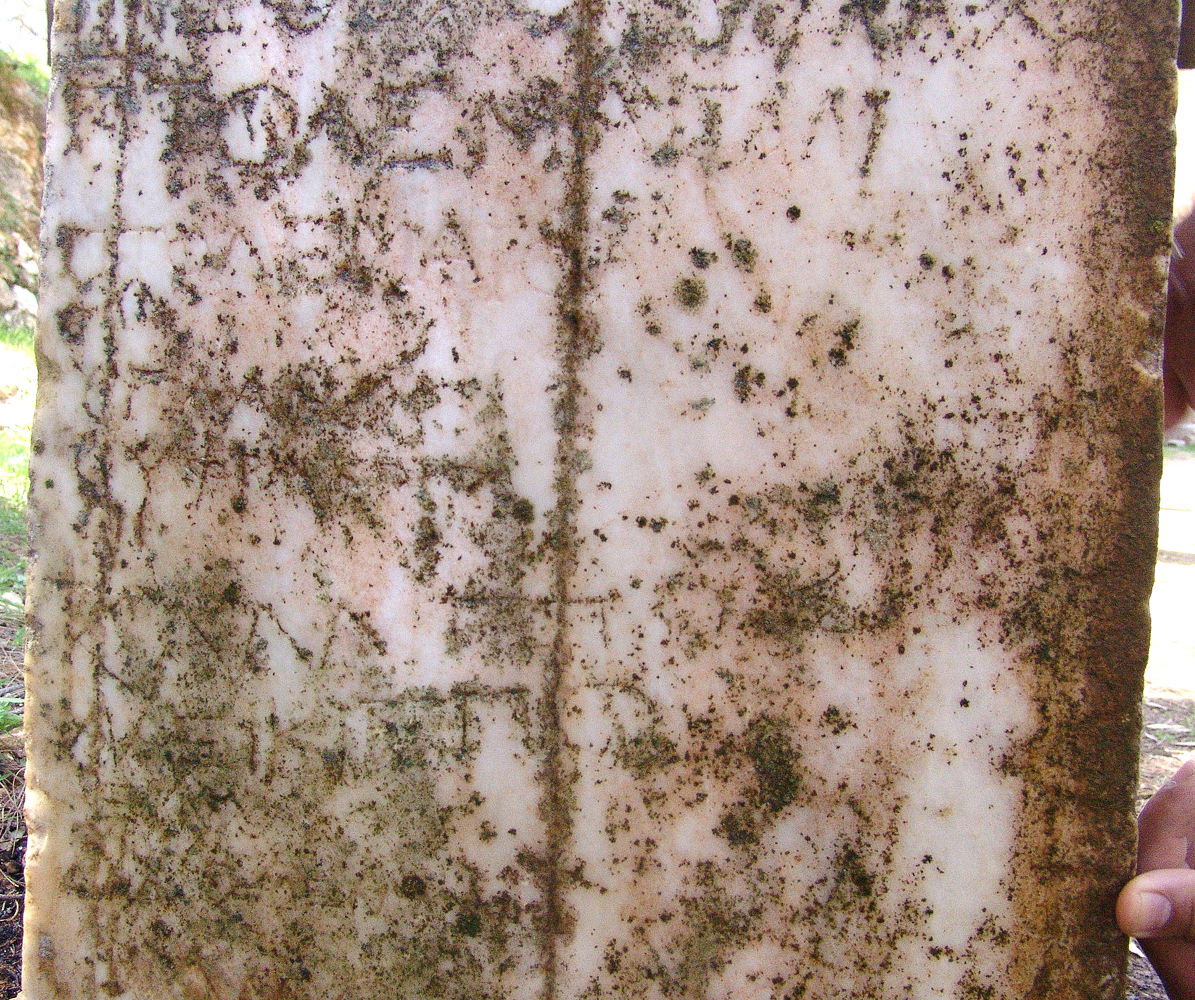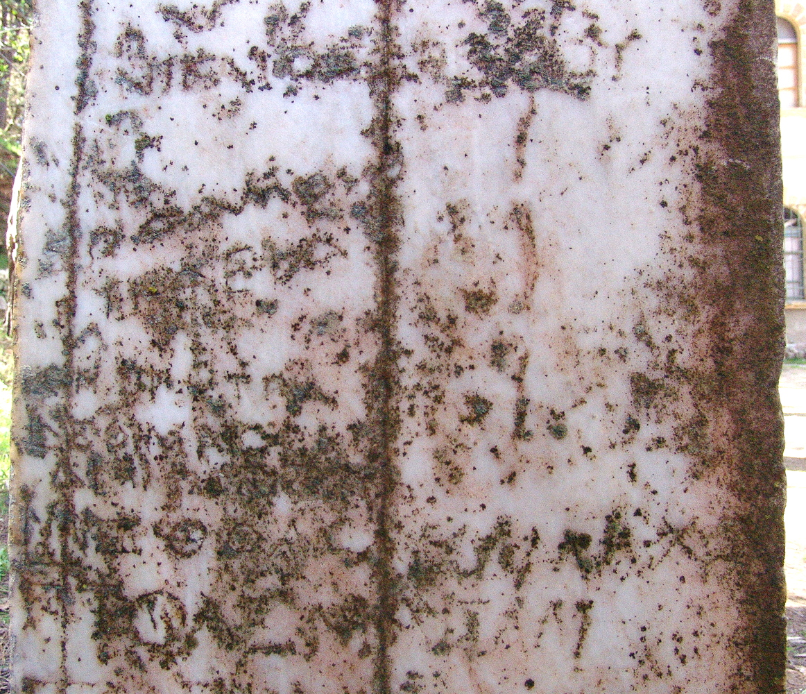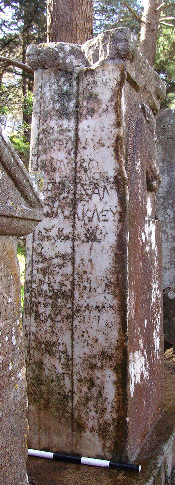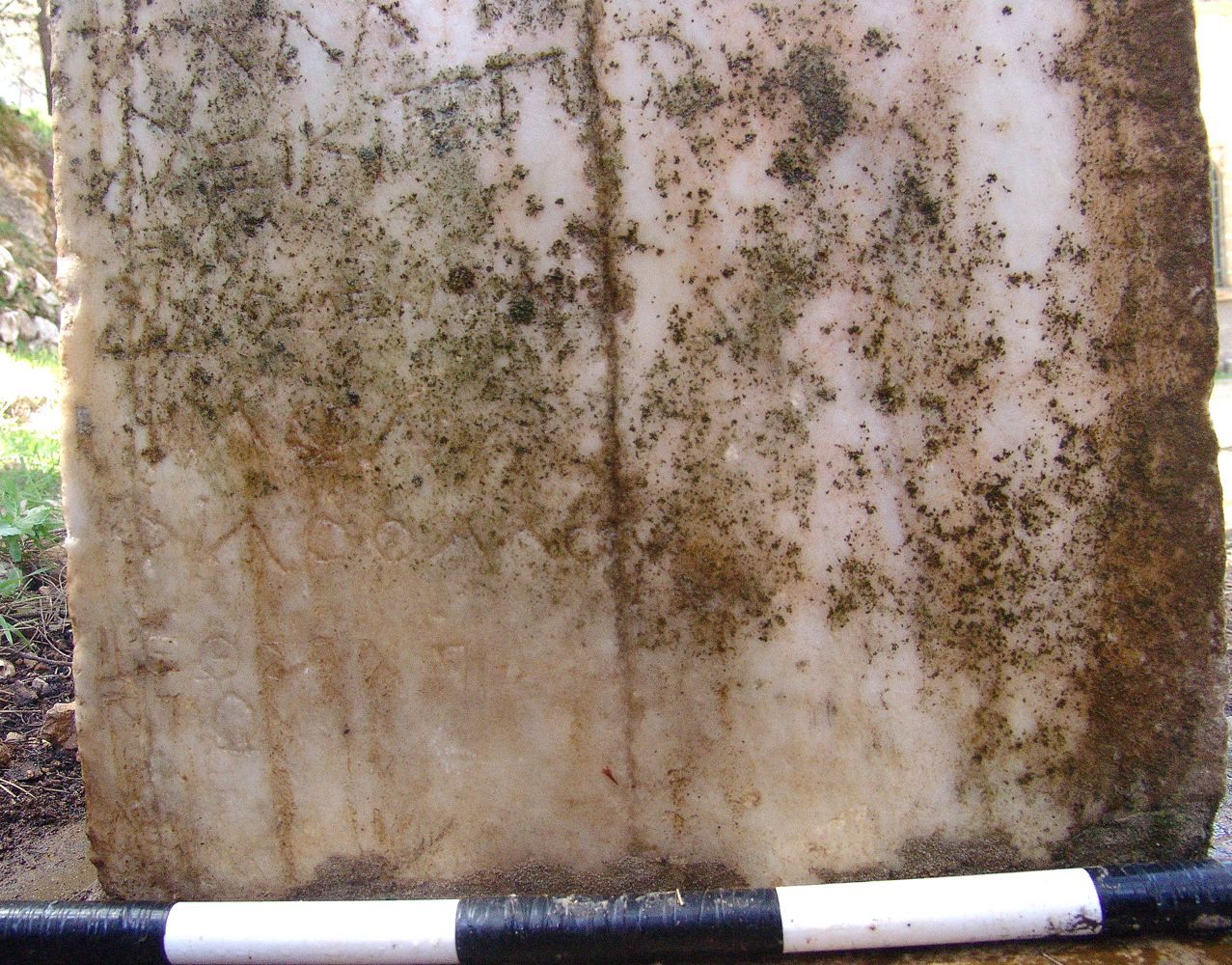Description: Marble stele tapering towards the top, moulded above, broken at the bottom: