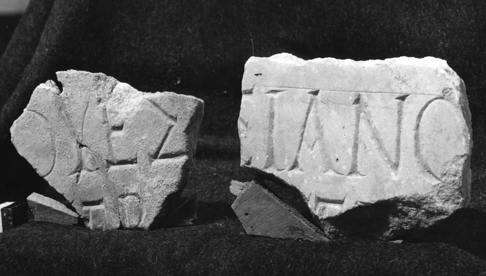 Description: Two adjoining fragments of marble a:, traces of burning, w: