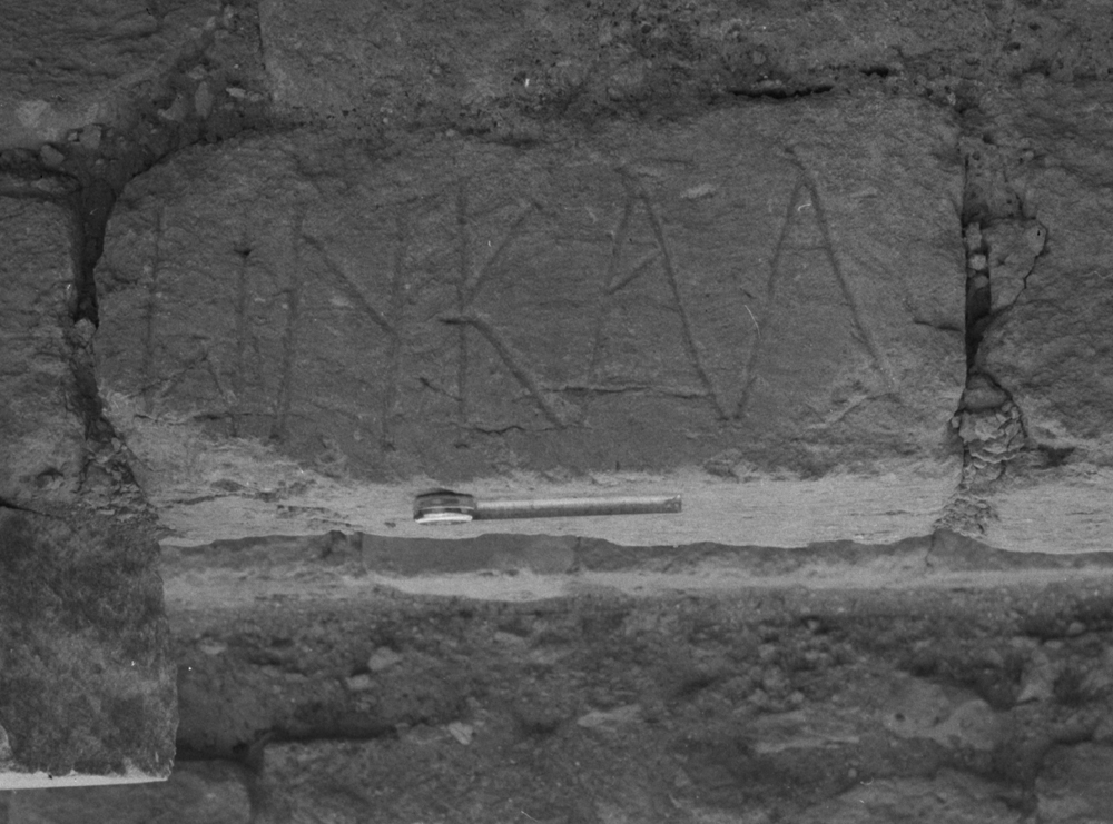 Valley Street, in a wall behind the Central Church, on the Southern side; found in 1958.
