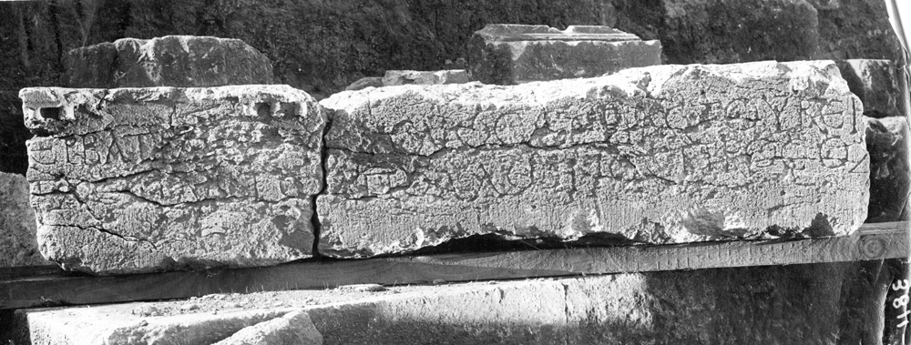 Text: Inscribed on the face of which the lower corner is broken away and the whole surface badly eroded.