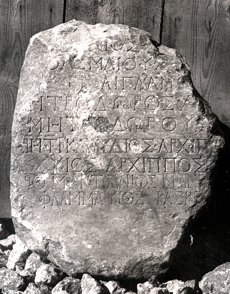 son) of Metrodoros; Year 98, Ti(berios) Klaudios (i.e. Ti(berius) Claudius) Archippos son of Archippos; Year 99, M(arkos) Antonios Kaskellios (i.e. M(arcus) Antonius Cascellius), son of M(arkos) Antonios Phlamma (i.e. M(arcus) Antonius Flamma); Year 101, K(ointos) Phabios (i.e. Q(uintus) Fabius) Philippos son of Philiskos.