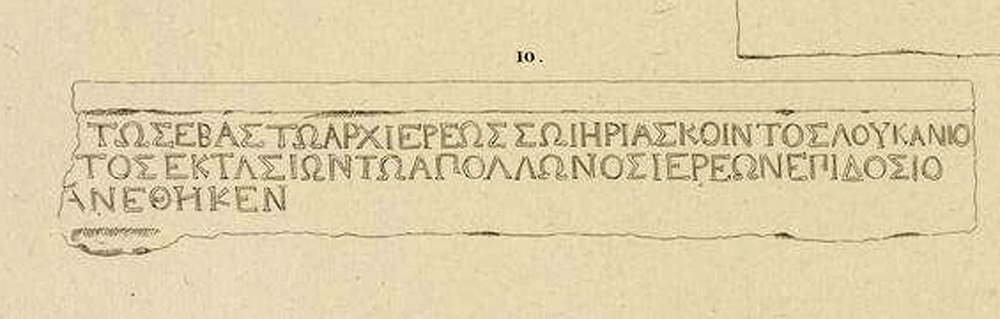 For the safety of [Emperor Caesar], son of [a god], Augustus, pontifex maximus, Quintus Lucanius [Proculus, son of Quintus], proconsul, dedicated (scil. the statue) from the contribution of the priesrts of Apollo.