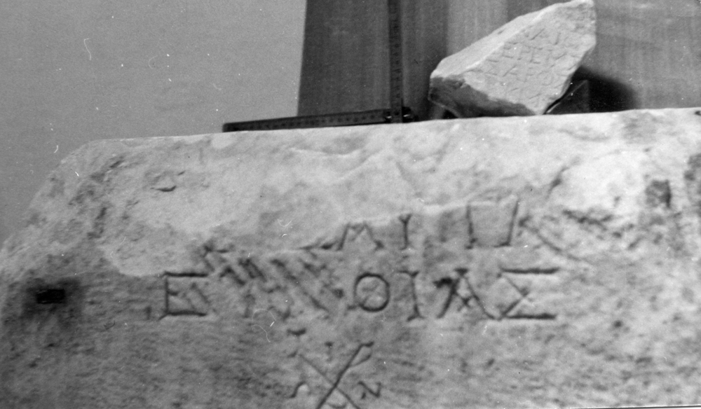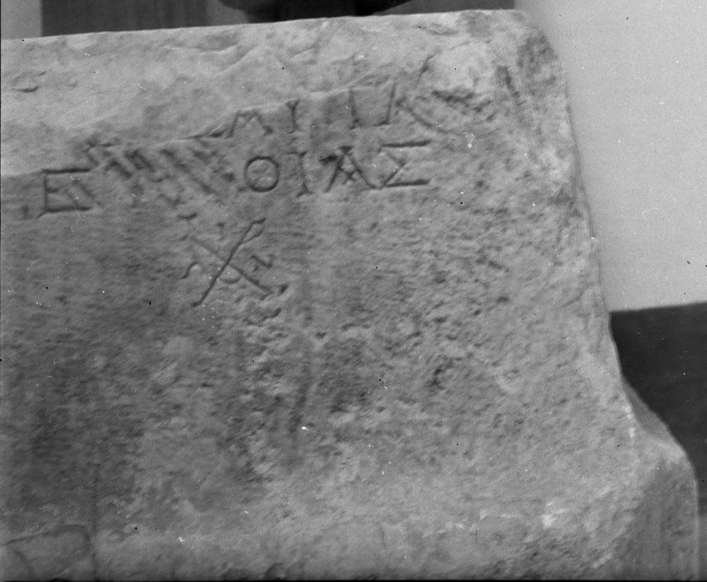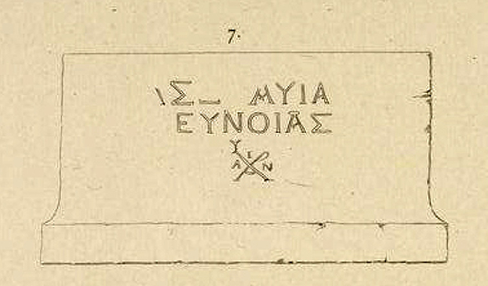 The monogram in line 3 was read by previous editors as representing χάριν 'thanks for', to be taken with the preceding genitive; but as Reynolds pointed out (art. cit.) this does not explain all the letters, which are better interpreted as referring to the Graces, to whom the monument was presumably dedicated - perhaps being a representation of them. This might be related to the dedication of one of the small unnamed temples in the area.