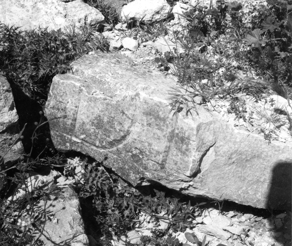 Description: Fragment of a limestone block broken above, below and at the left end, but possibly complete at the right