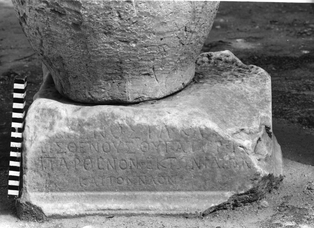 Claudia Venusta, daughter of Claudius Kartisthenes, gave the Parthenos from her own funds, and the temple.