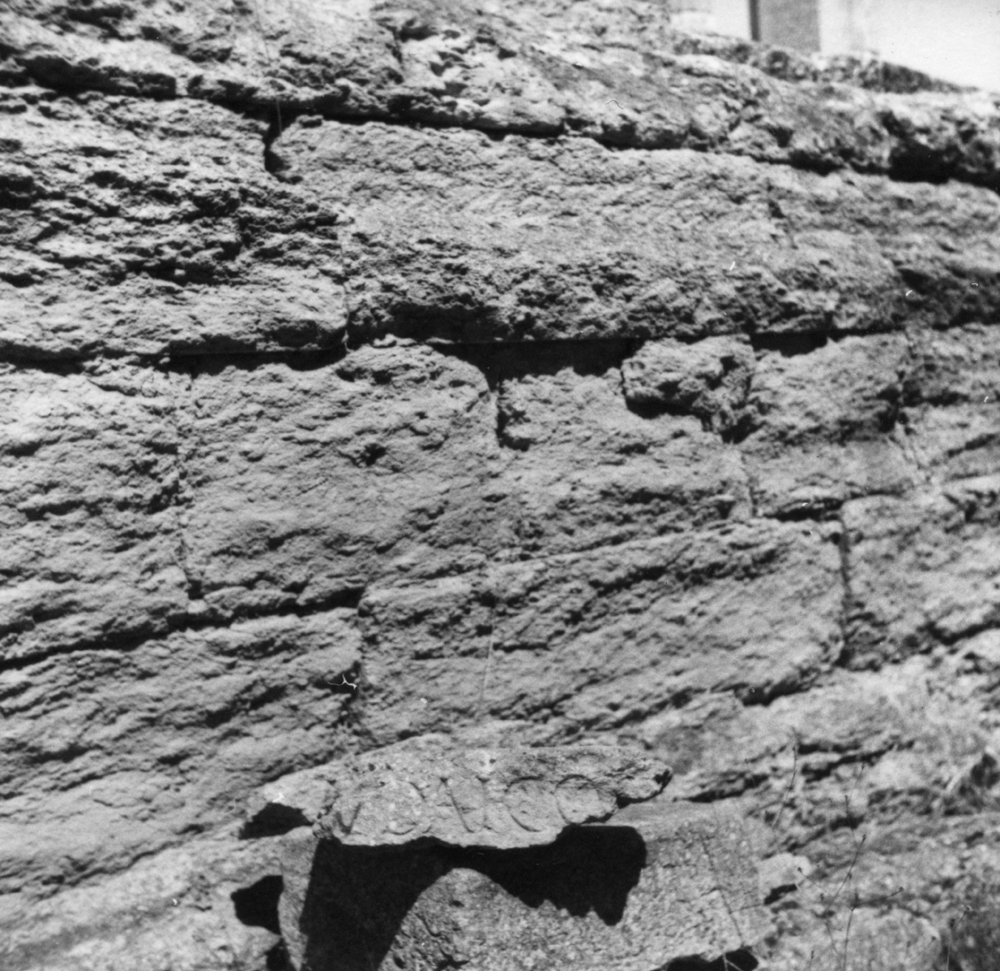 Description: Damaged block of limestone, reused in a wall.