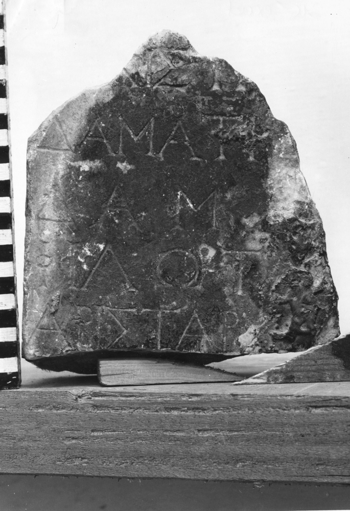 Text: Inscribed on one face which is now blackened ?with burning; the photograph taken at the time of discovery shows