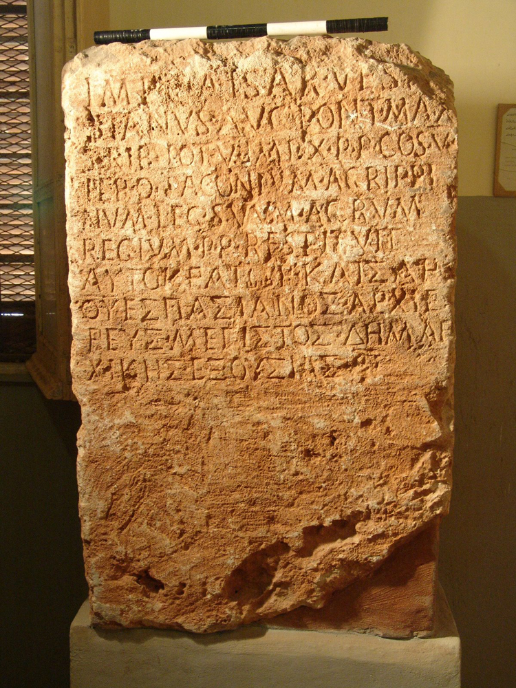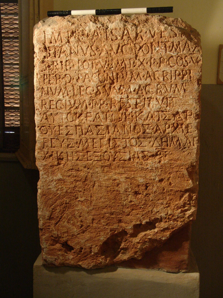 (Greek): Emperor Caesar Vespasianus Augustus, high priest, holding tribunician power for the fifth time, acclaimed imperator ten times, father of the fatherland, consul five times, through the agency of [Q(uintus) Pa]conius Agrippinus, his envoy, restored the royal estate to the Roman People.