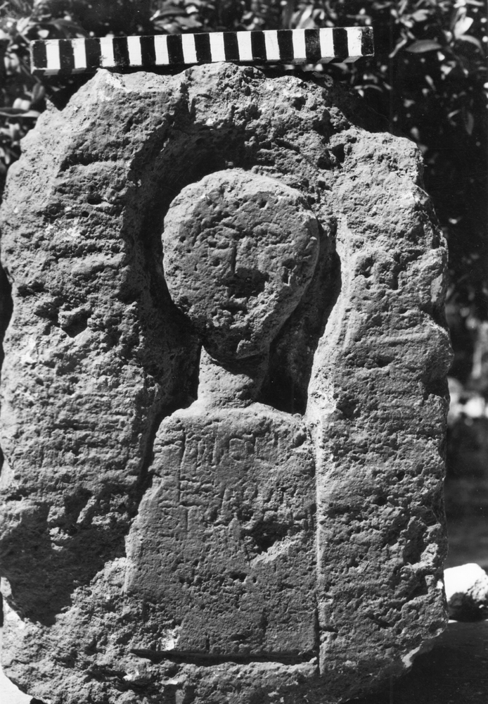 Description: Round-headed stele of brown limestone, slightly damaged on top (w: