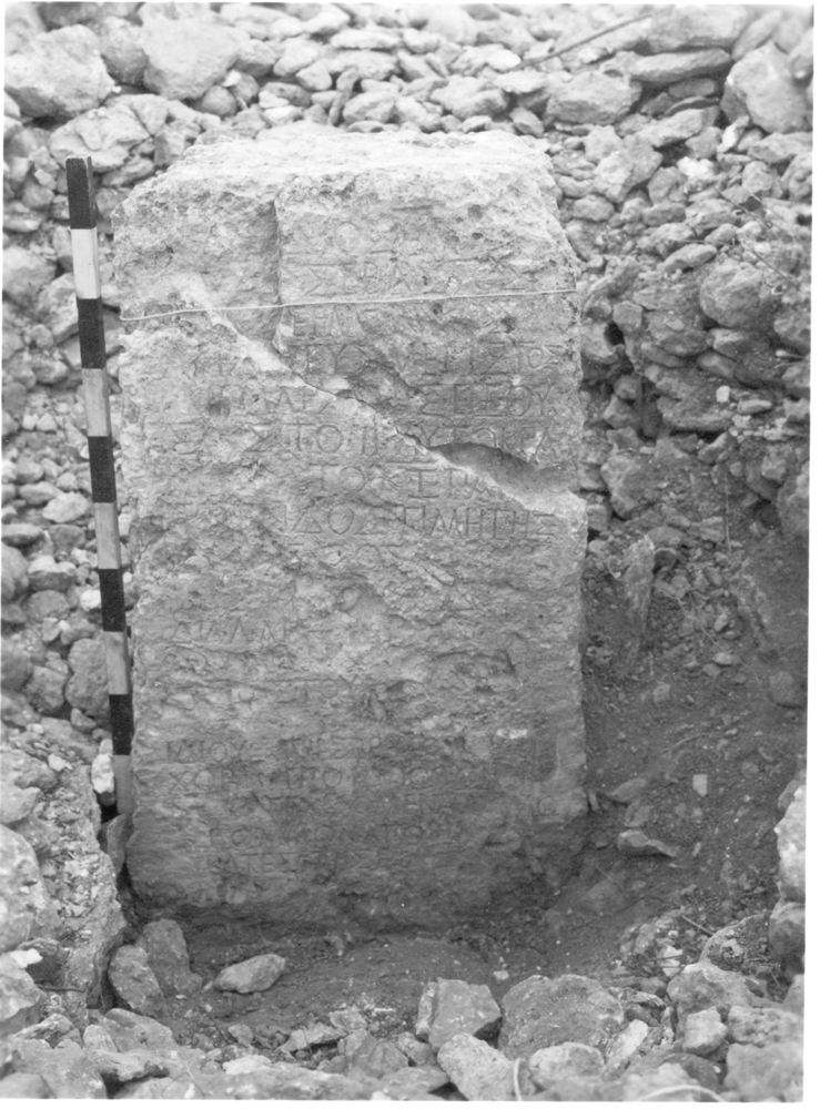 b: The reverse face, on a prepared surface, which is considerably worn. c. The left side of the stele.
