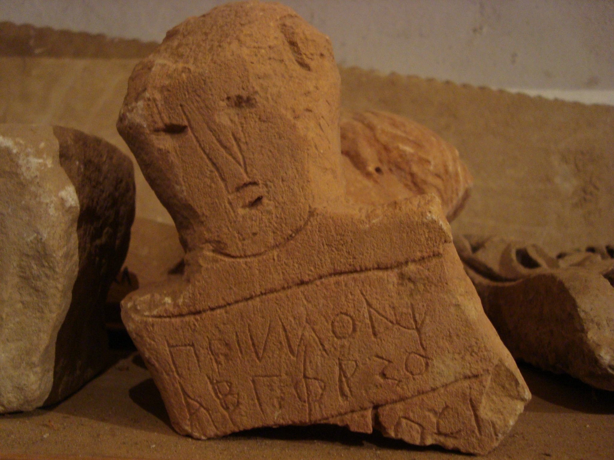 with a projecting above showing rough incisions for two eyes, a nose and a mouth, broken away below.