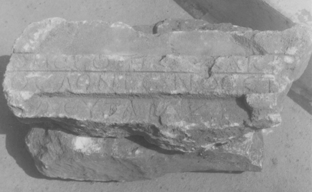 Text: Inscribed on one face across the architrave and on the face below which was flanked by pillars in relief.