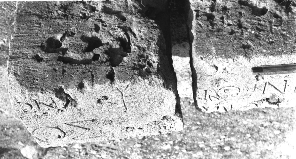 Text: Graffiti on one face; three different hands; the monogram (line 4) is written to the left of lines 1-3.