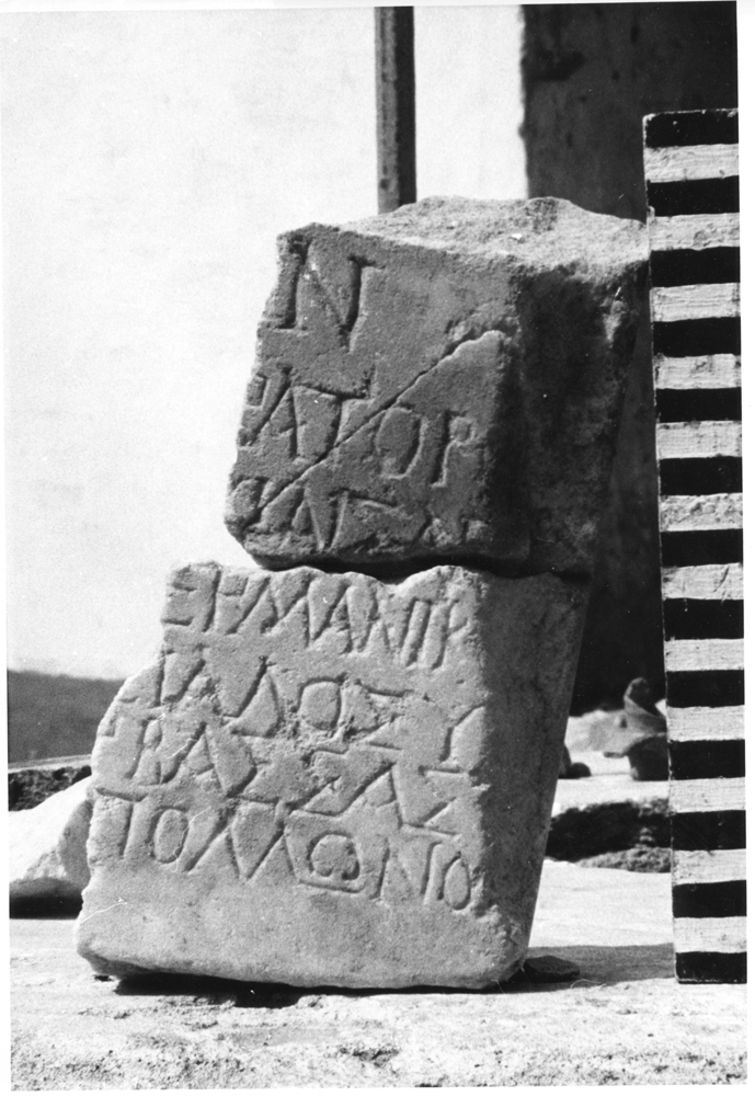 Domitia Augusta, wife of Emperor Domiian Caesar Augustus, victor in Germania: [ . . -]os (scil. son) of Ial, [ . . . ], Hyperbassas [priests ] of Apollo (scil. dedicated her statue)