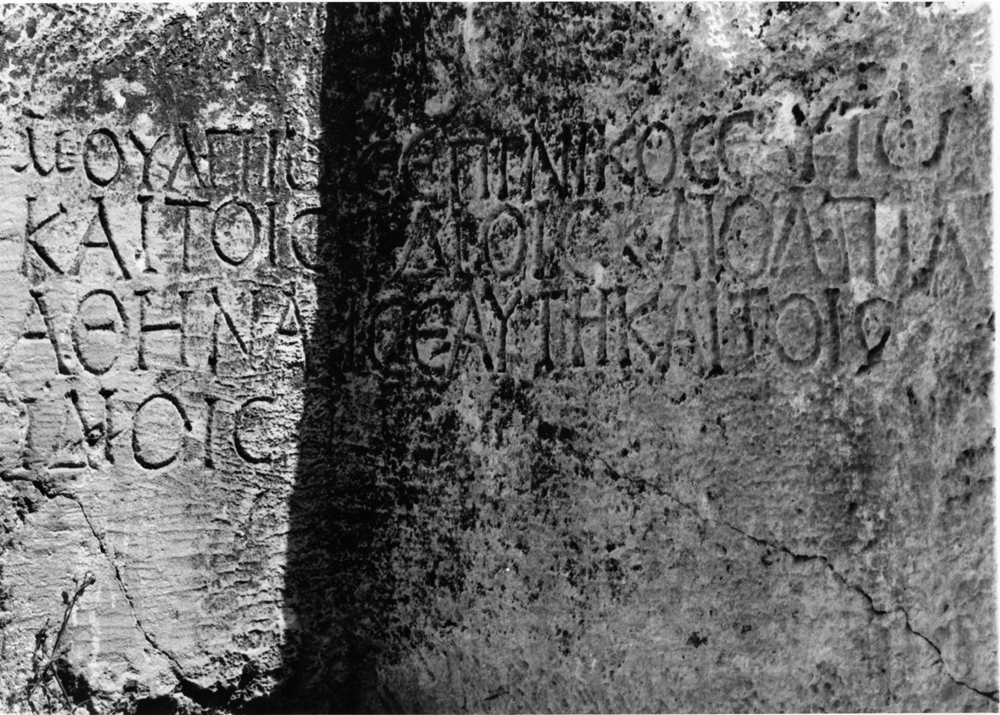 M(arkos) Oulpios (i.e. Marcus Ulpius) Epinikos, for himself and his family and Olpia (i.e. Ulpia) Athenais for herself and her family.