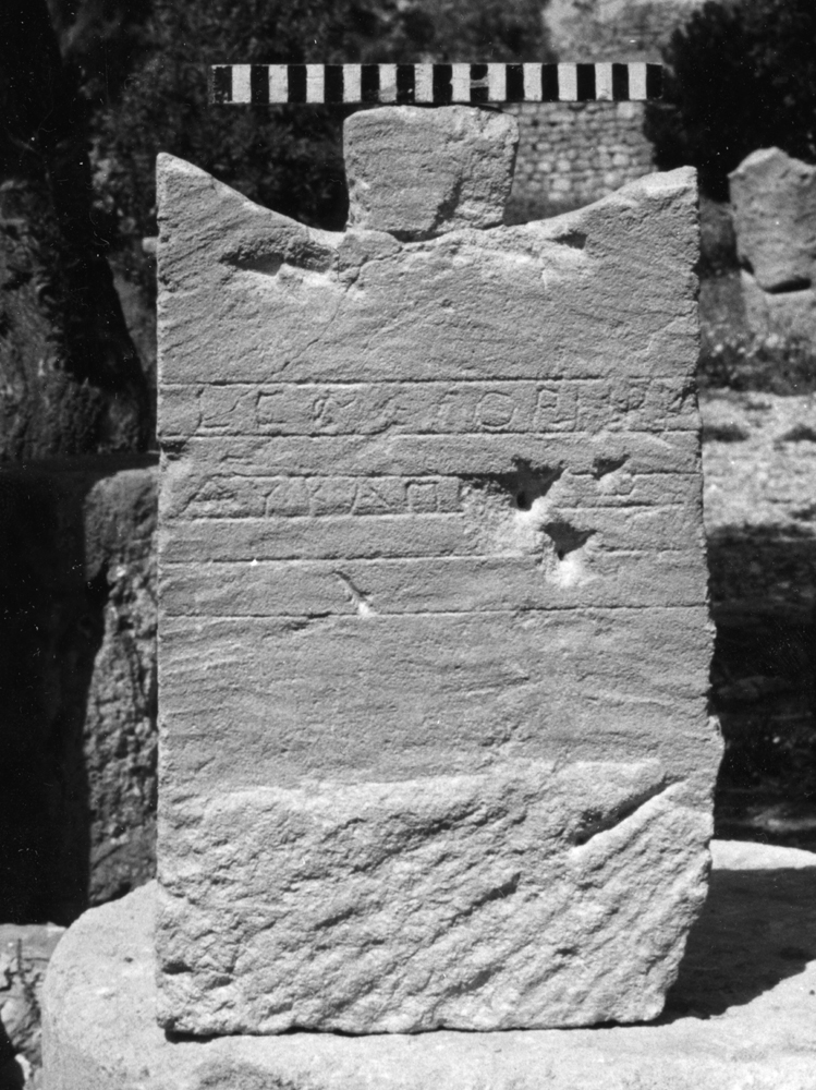 Description: Limestone stele with three protrusions at the upper edge - a rectangular ‘head’ and triangular ‘shoulders’.