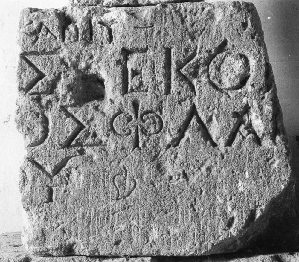 modern village, re-used in the wall surrounding a house near the former Military Police Station; found before 1941