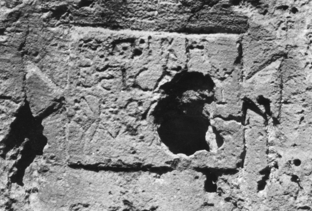 whose surface is badly damaged. Above the door, to the right.