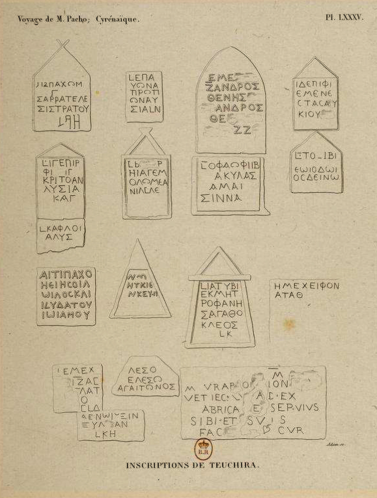 Bibliography: Pacho, 1827 LXXXV, whence CIG, Vol.III, 5311,ll.6, 7; Oliverio, DAI, 1933-1936, 385 (259, La.XV.3,3), p. 219, whence SEG 9.650; Lüderitz-Reynolds, 1983 46.c.