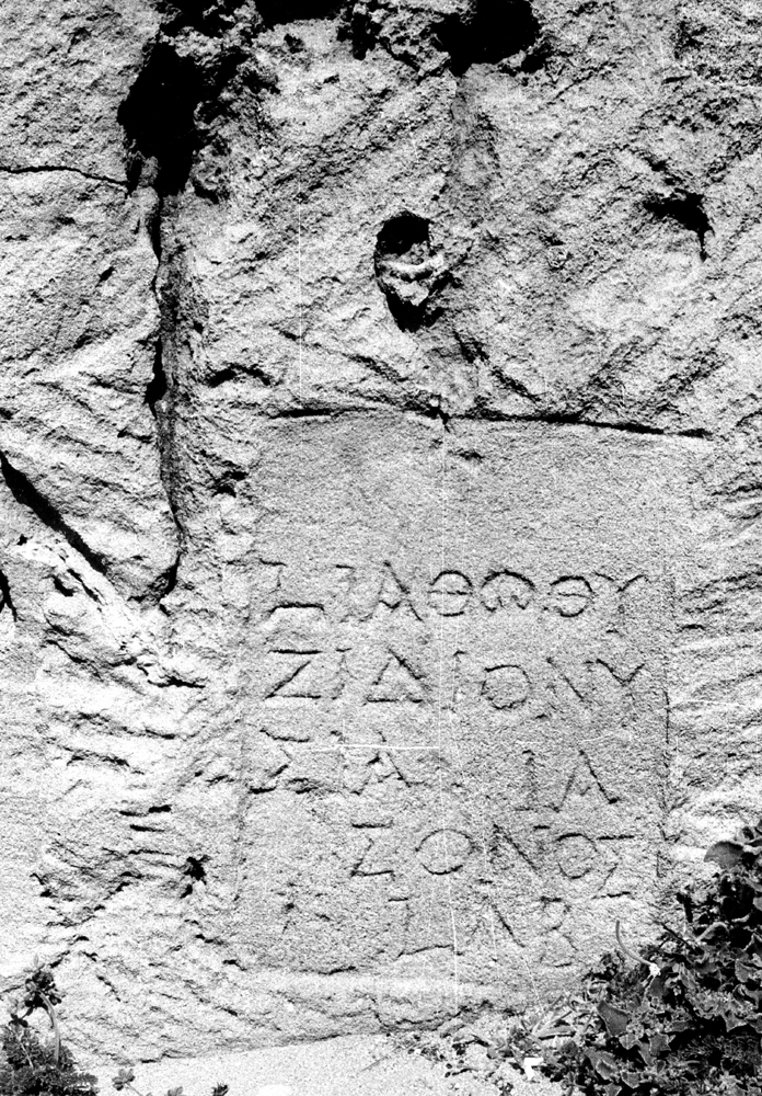 Description: Rock-cut tomb, still partly buried, inscribed on