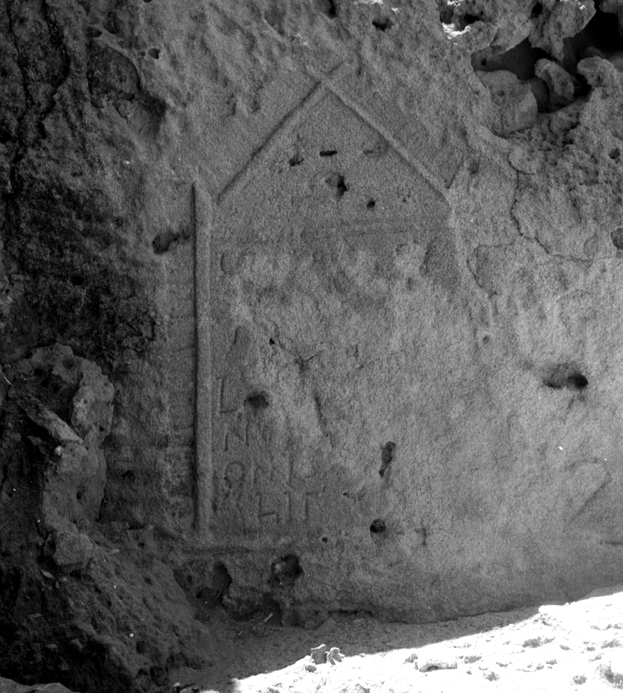 outlined in relief, the surface badly damaged since it was first read; on an east-facing abutment of wall to the right of