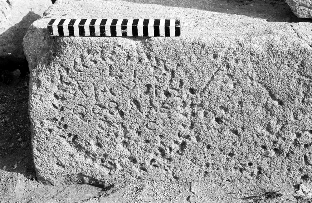 formal inscriptions have been cut at irregular intervals along both courses, most of them within wreaths of varying patterns.